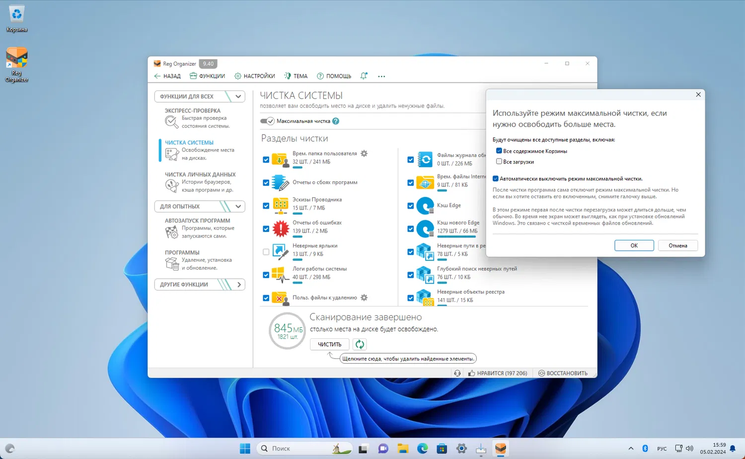 - Режим максимальной чистки в инструменте "Чистка системы": В этом режиме теперь используются специализированные настройки, позволяющие находить и удалять больше ненужных файлов, чем ранее, благодаря изменению настроек разделов чистки для максимального освобождения места.