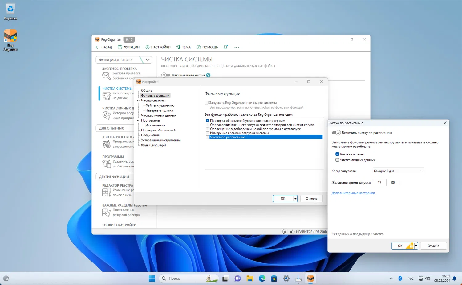 - Чистка по расписанию (фоновая): Эта функция позволяет программе автоматически запускаться в фоновом режиме согласно установленному расписанию, чтобы периодически сообщать пользователю о возможности освободить дополнительное дисковое пространство. Функция доступна в меню Настройки > Фоновые функции > Чистка по расписанию, для ее активации потребуется действующая лицензия Reg Organizer.