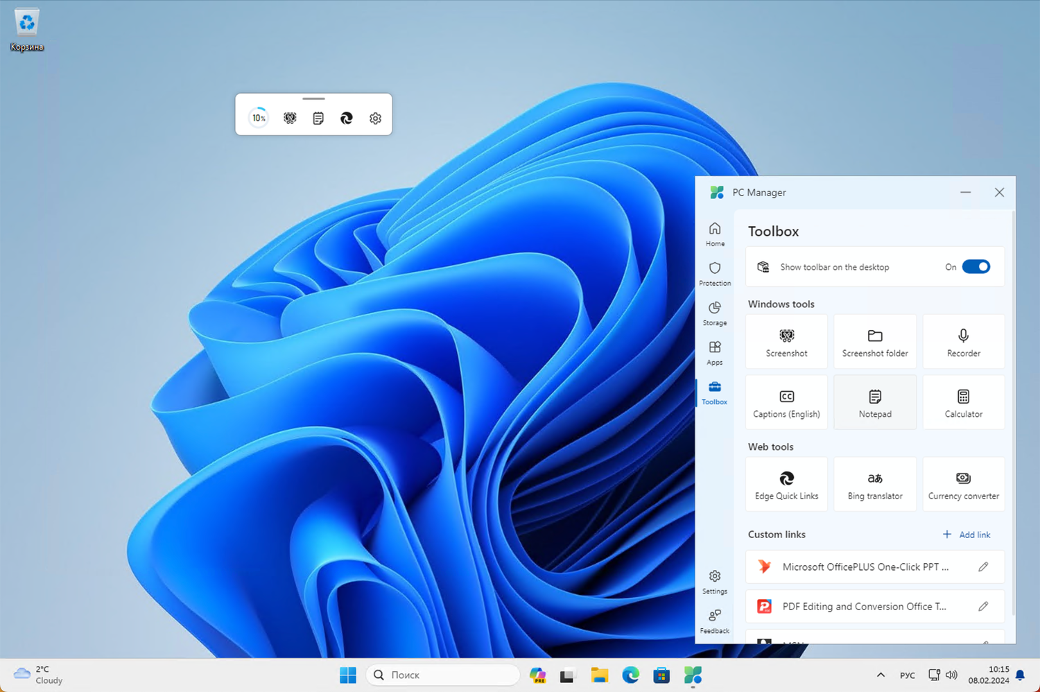 Кроме базового обслуживания, Microsoft PC Manager предлагает некоторые дополнительные возможности, такие как плавающая панель инструментов с индикатором использования оперативной памяти, ссылка на «Ножницы», возможность быстро закреплять сайты и многое другое. Предлагается даже аналог диспетчера задач, который позволяет вам просматривать запущенные процессы, выяснять, сколько оперативной памяти потребляет каждый из них, и завершать процессы, которые неэкономно поглощают ресурсы вашего компьютера. Вы можете оставить плавающую панель на экране или выбрать автоматически закрываемую боковую панель.