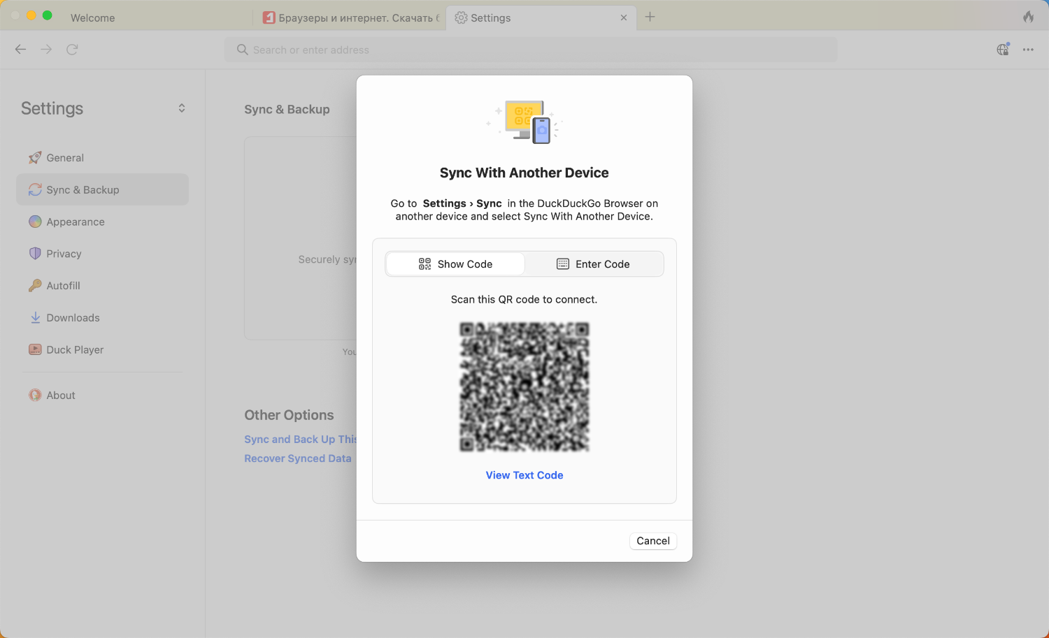 - В браузере появится QR-код, который можно отсканировать с помощью камеры телефона. Также можно использовать вид Text code (буквенно-цифровой), который можно скопировать и вставить на устройство. Это полезно для синхронизации данных между двумя ПК.