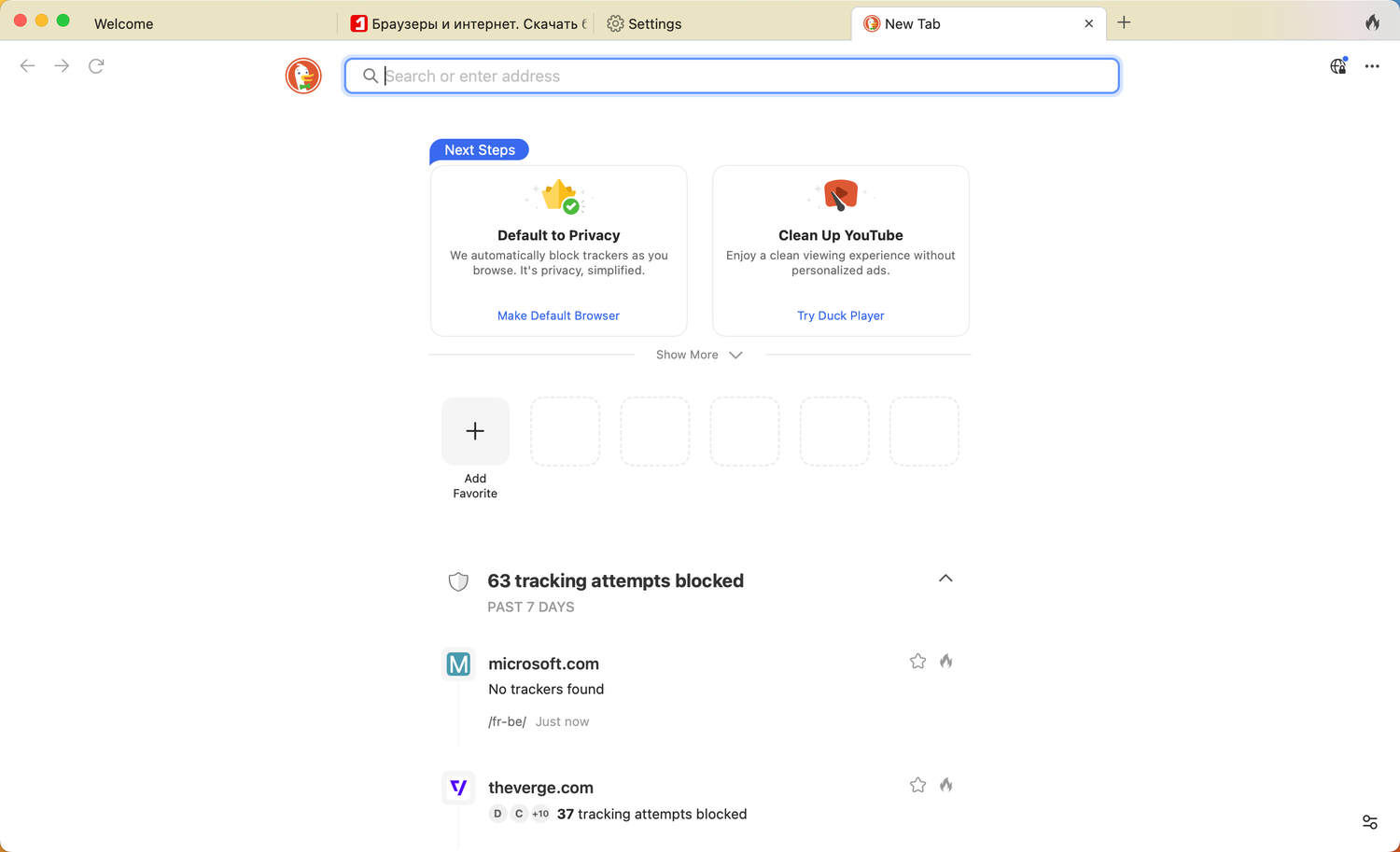 Браузер DuckDuckGo прошел долгий путь с момента дебюта на macOS в 2022 году. Настольная версия поддерживает Duck Player, который позволяет просматривать видео с YouTube. Приложение имеет встроенный блокировщик рекламы, блокировщик трекеров и поддерживает менеджер паролей Bitwarden (на macOS). Тем не менее, браузер не поддерживает списки фильтров блокировки рекламы, поэтому тонкая настройка недоступна.
