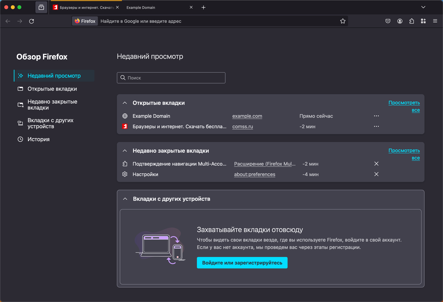 - Firefox View, доступный через специальную кнопку в верхнем левом углу интерфейса браузера, теперь поддерживает поиск. Это позволяет быстро находить открытые, закрытые вкладки или вкладки с других устройств.