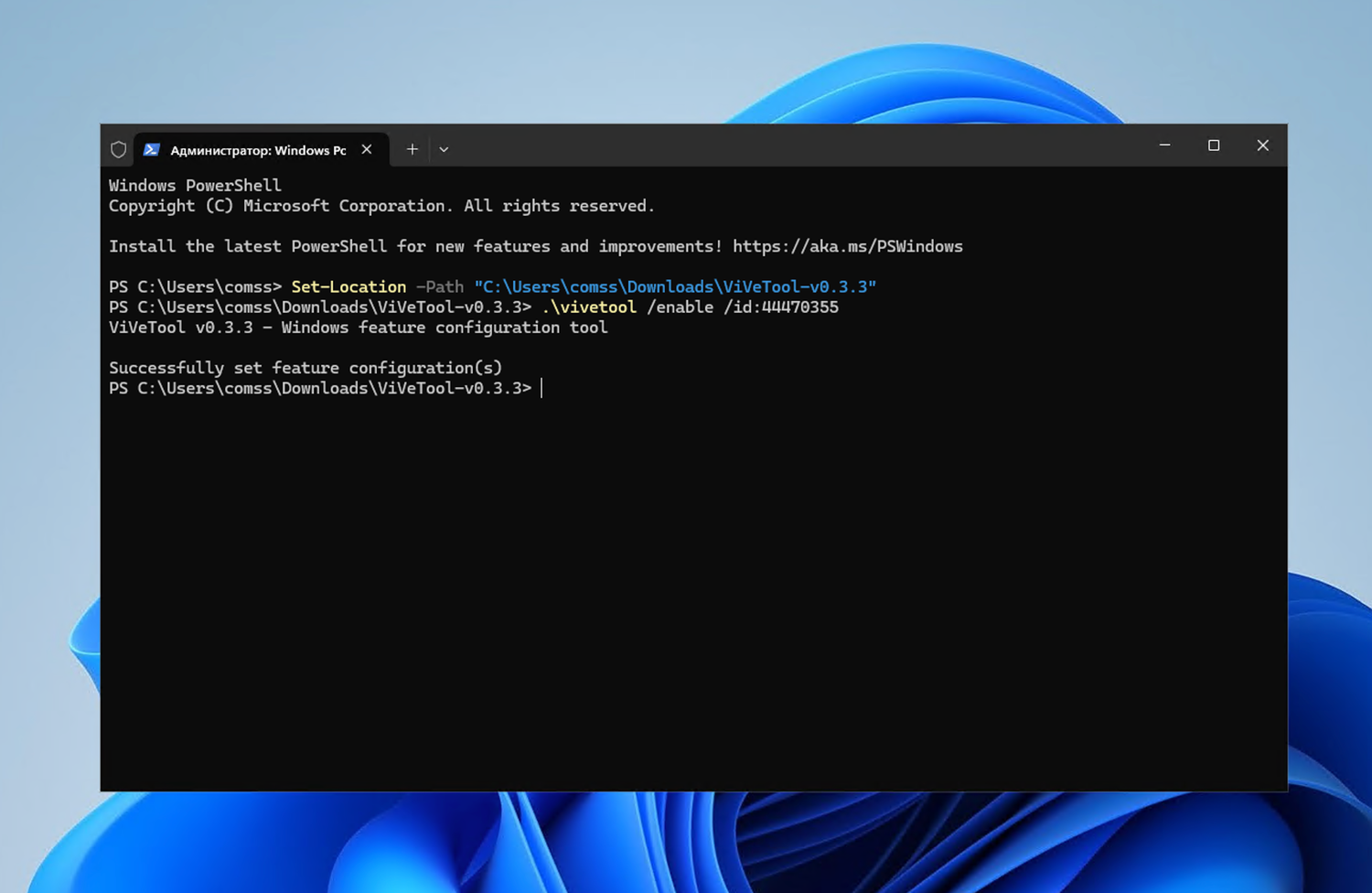 Примечание: В примерах используются команды в Терминале для профиля PowerShell . Если вы используете профиль Командная строка, замените начальную команду .\vivetool на vivetool.
