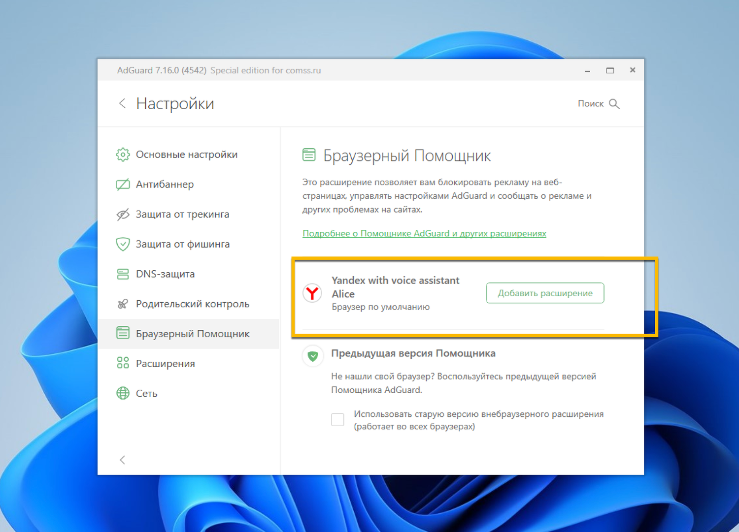 В AdGuard для Windows это делается через меню Настройки > Браузерный Помощник > Добавить расширение, а для пользователей AdGuard для Mac – через Настройки… > Помощник > Установить.