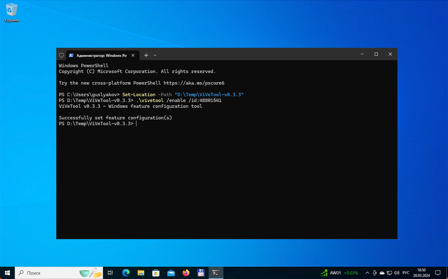 Примечание: В примерах используются команды в Терминале для профиля PowerShell . Если вы используете профиль Командная строка, замените начальную команду .\vivetool на vivetool.
