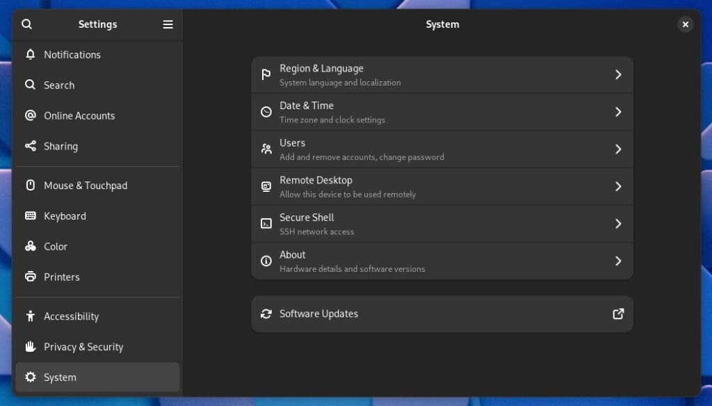 Приложение "Настройки" получило новый упрощённый интерфейс, особенно в меню "Система", где теперь сгруппированы такие подменю, как "Регион и язык", "Дата и время" и "Пользователи".
