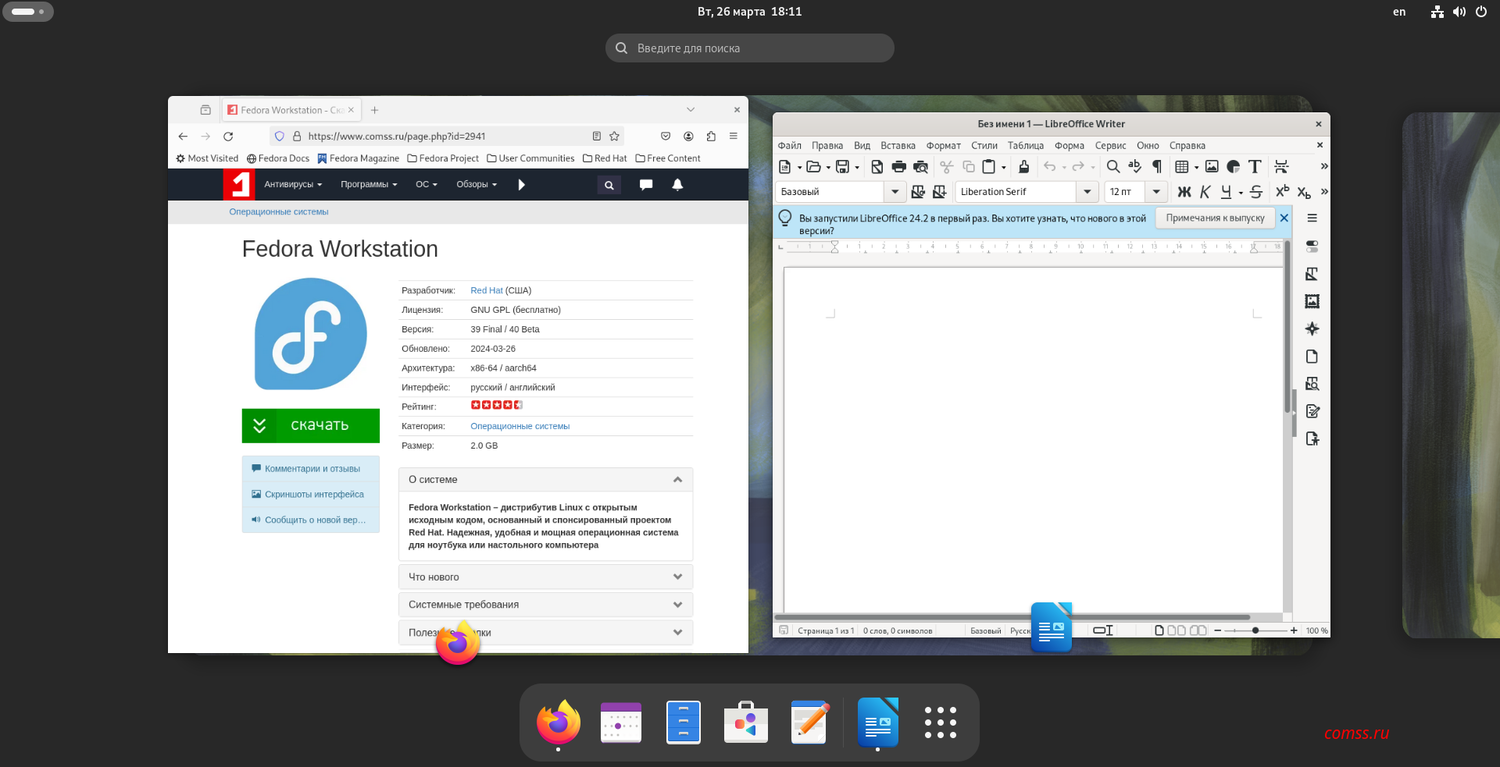 В дополнение к техническим новшествам, Fedora Linux 40 предлагает обновленный набор программного обеспечения, включая офисный пакет LibreOffice 24.2 и веб-браузер Mozilla Firefox 124, обеспечивающие современный и удобный пользовательский опыт.