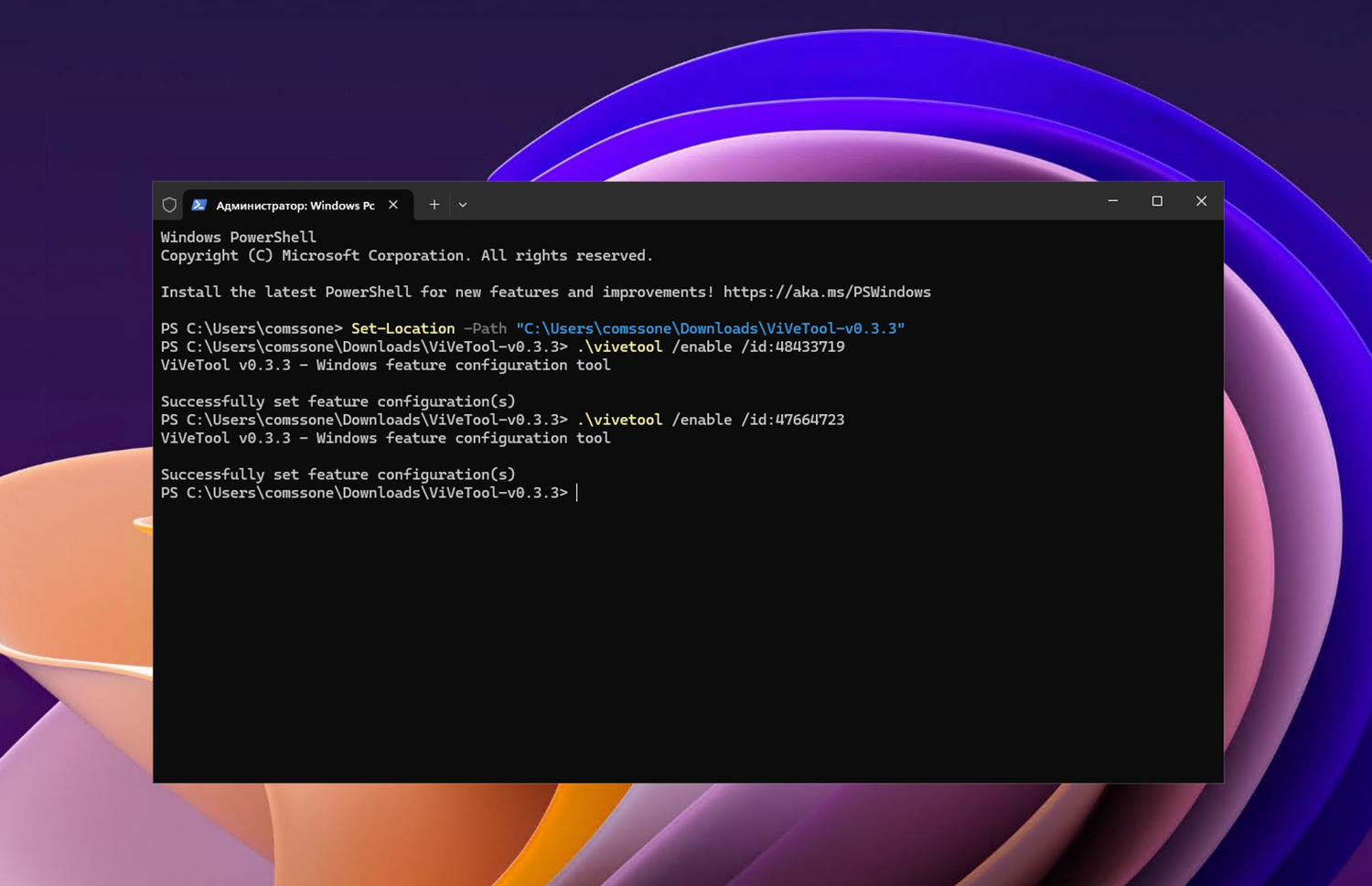 Примечание: В примерах используются команды в Терминале для профиля PowerShell . Если вы используете профиль Командная строка, замените начальную команду .\vivetool на vivetool.