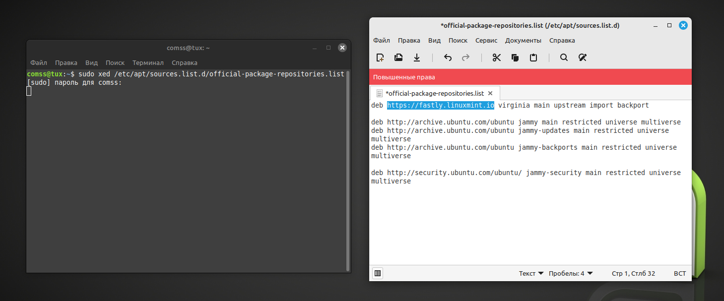 - Отредактируйте файл /etc/apt/sources.list.d/official-package-repositories.list, воспользовавшись командой: