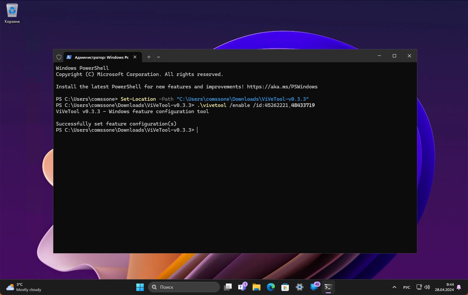 Примечание: В примерах используются команды в Терминале для профиля PowerShell . Если вы используете профиль Командная строка, замените начальную команду .\vivetool на vivetool.