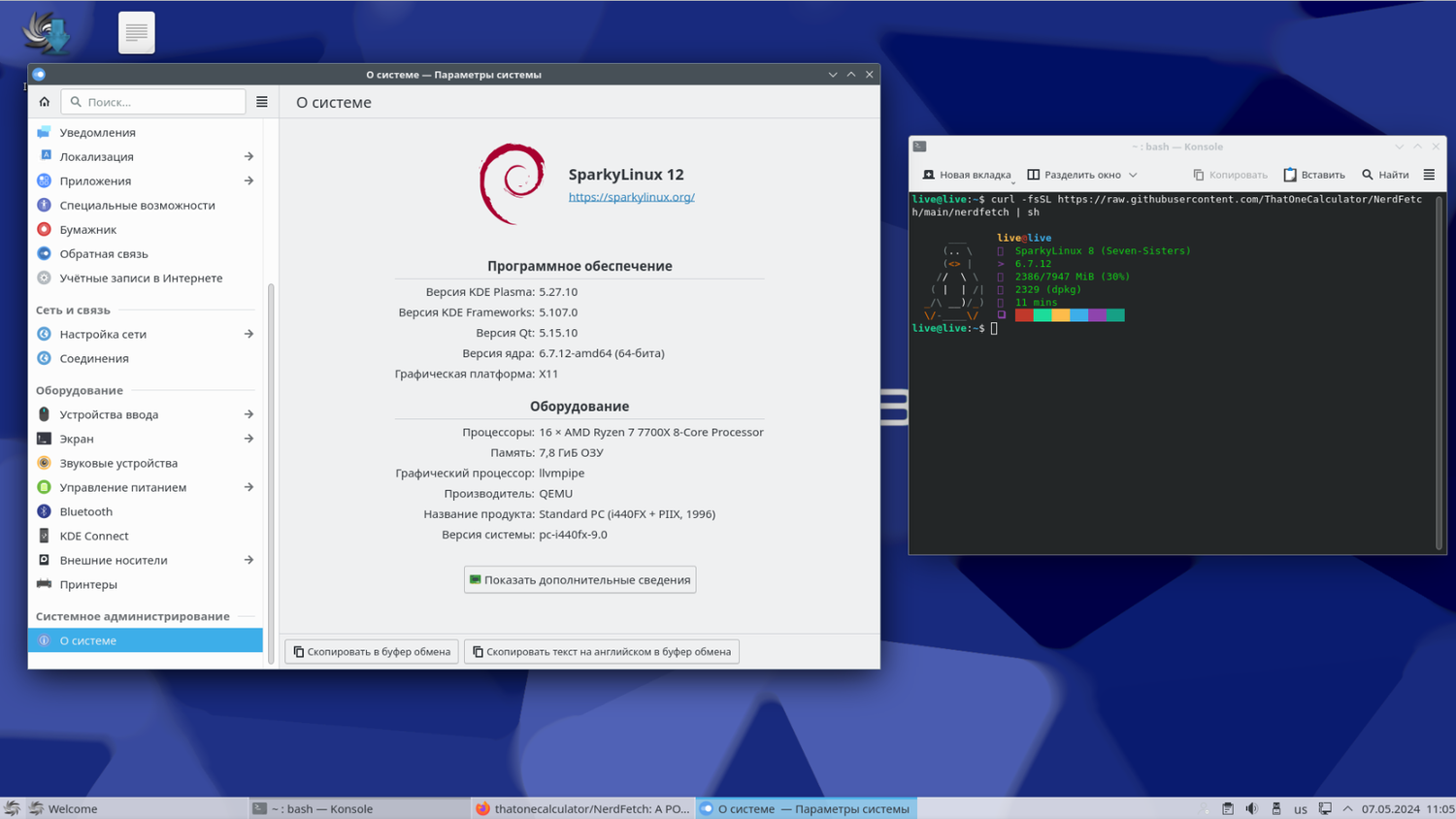 5. Рабочие окружения: Несмотря на обновление, версия LXQt в Sparky 2024.05 осталась 1.4, хотя в апреле была выпущена версия LXQt 2.0. Пользователи десктопной среды MATE найдут, что калькулятор 'galculator' заменен на 'mate-calc'. Также добавлены новые пакеты, такие как 'orca' и 'qt6', улучшающие доступность и настройки пользовательской среды. Рабочее окружение KDE Plasma поставляется с версией 5.27.10.