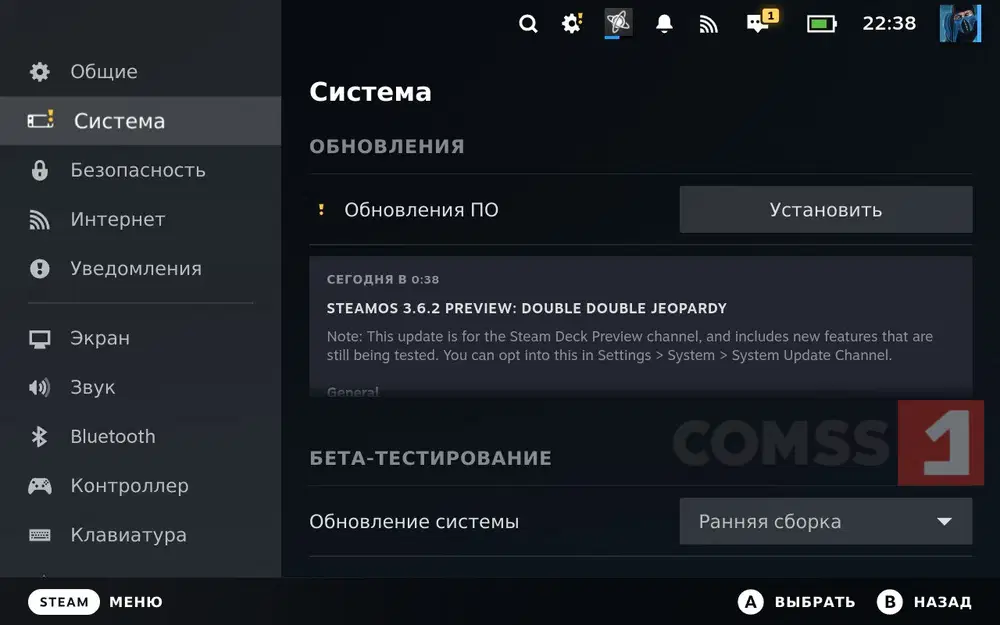 Новая версия SteamOS 3.6.2 доступна только на канале «Ранняя сборка» (Preview), для перехода на который необходимо вручную изменить настройки Steam Deck в разделе Steam > Система > Бета-тестирование. В выпадающем списке нужно выбрать «Ранняя сборка», после чего Steam Deck потребуется перезагрузить.