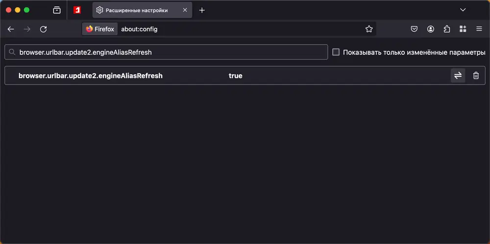 - Найдите параметр browser.urlbar.update2.engineAliasRefresh