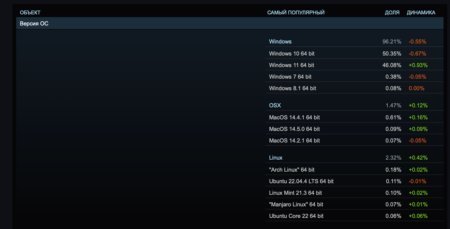Данные показывают значительное изменение в предпочтениях пользователей, во многом благодаря популярности Steam Deck, который показывает, что Linux может быть привлекательной платформой для геймеров.