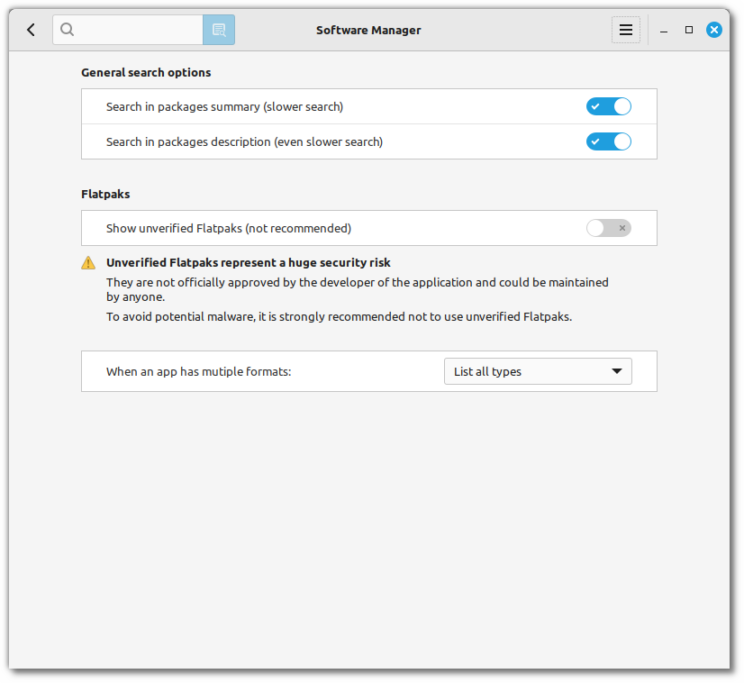 Менеджер программного обеспечения mintinstall теперь загружается быстрее, а также включает отключение непроверенных приложений Flatpak по умолчанию и предупреждение о связанных с ними рисках безопасности.