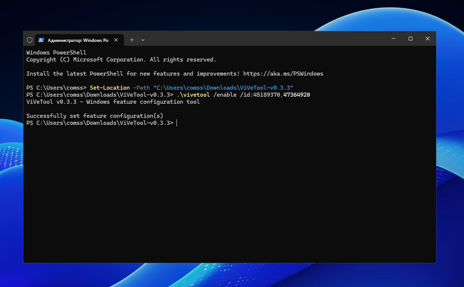Примечание: В примерах используются команды в Терминале для профиля PowerShell . Если вы используете профиль Командная строка, замените начальную команду .\vivetool на vivetool.