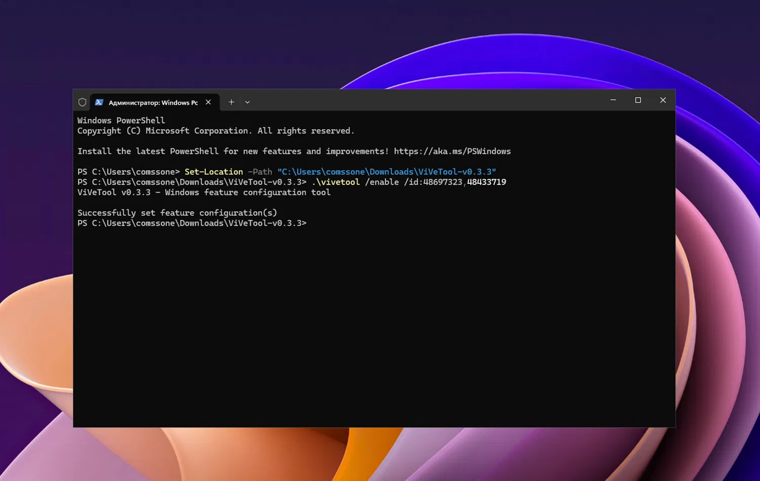 Примечание: В примерах используются команды в Терминале для профиля PowerShell . Если вы используете профиль Командная строка, замените начальную команду .\vivetool на vivetool.