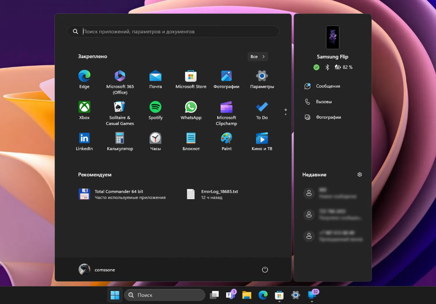 Доступ к функциям «Связь с телефоном» через меню «Пуск» в Windows 11