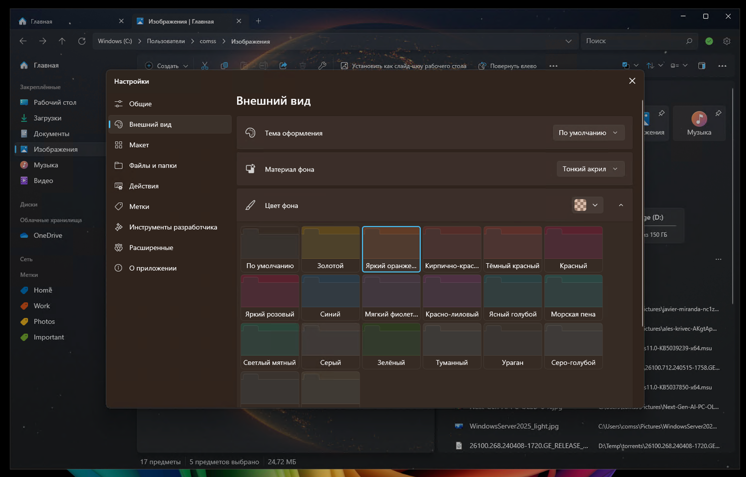Другим значительным нововведением в Files 3.5 является поддержка системного фона "Thin acrylic" (Тонкий акрил). Этот стиль предусматривает применение полупрозрачных текстур, которые добавляют глубину и текстуру интерфейсу без ущерба для читаемости. Фон "Thin acrylic" интегрируется с рабочим столом Windows, создавая ощущение единства и гармонии с операционной системой.