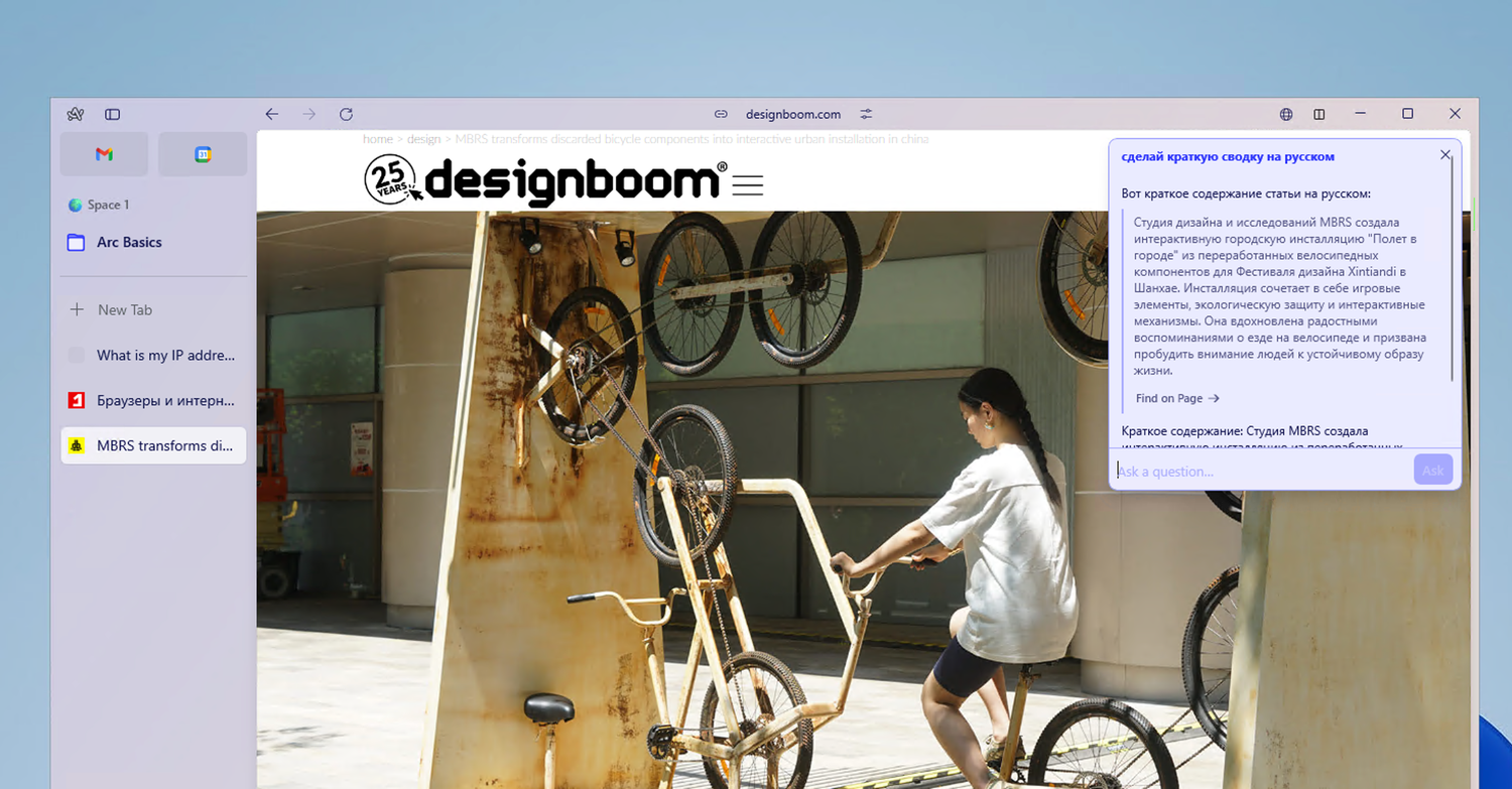 • Ask on Page: Теперь, используя сочетание клавиш CTRL + F, пользователи могут задавать вопросы о текущей странице, и Arc предоставит мгновенные ответы. Эту функцию можно включить или отключить в настройках браузера Arc.