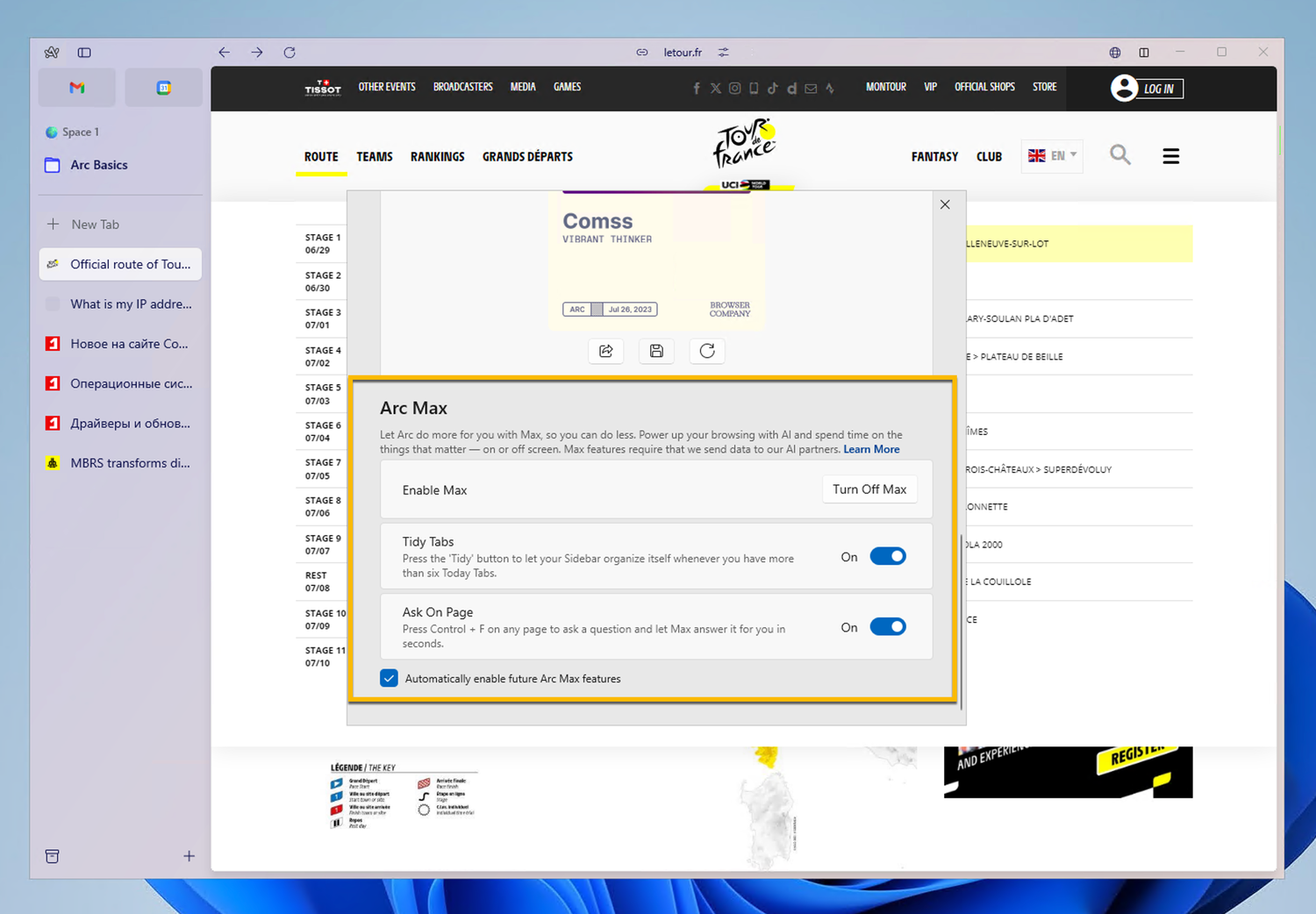 В версии 1.10.0 пользователи Windows могут воспользоваться новыми функциями пакета Arc Max, разработанными на основе искусственного интеллекта, чтобы сделать веб-просмотр более эффективным и удобным.