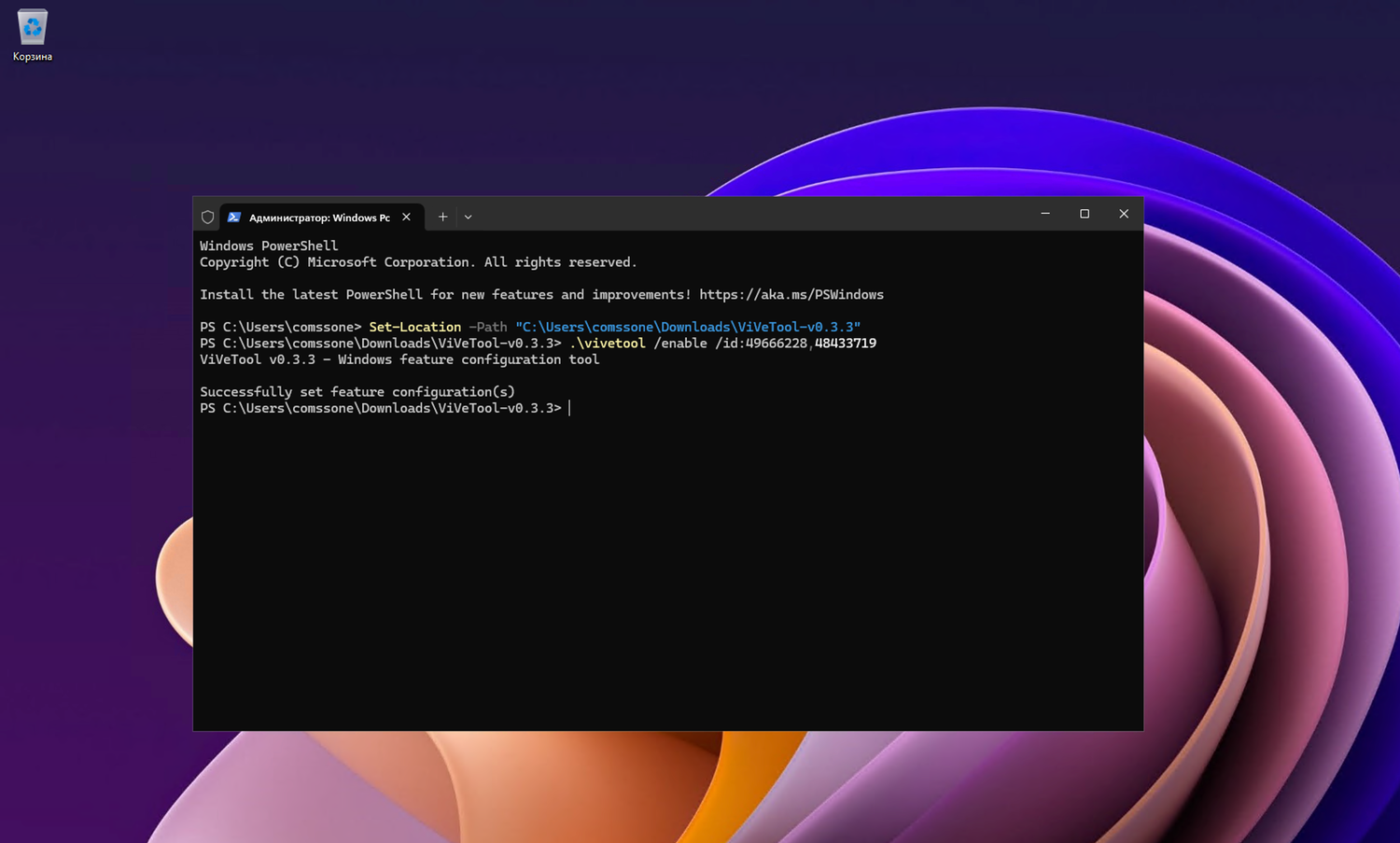 Примечание: В примерах используются команды в Терминале для профиля PowerShell . Если вы используете профиль Командная строка, замените начальную команду .\vivetool на vivetool.