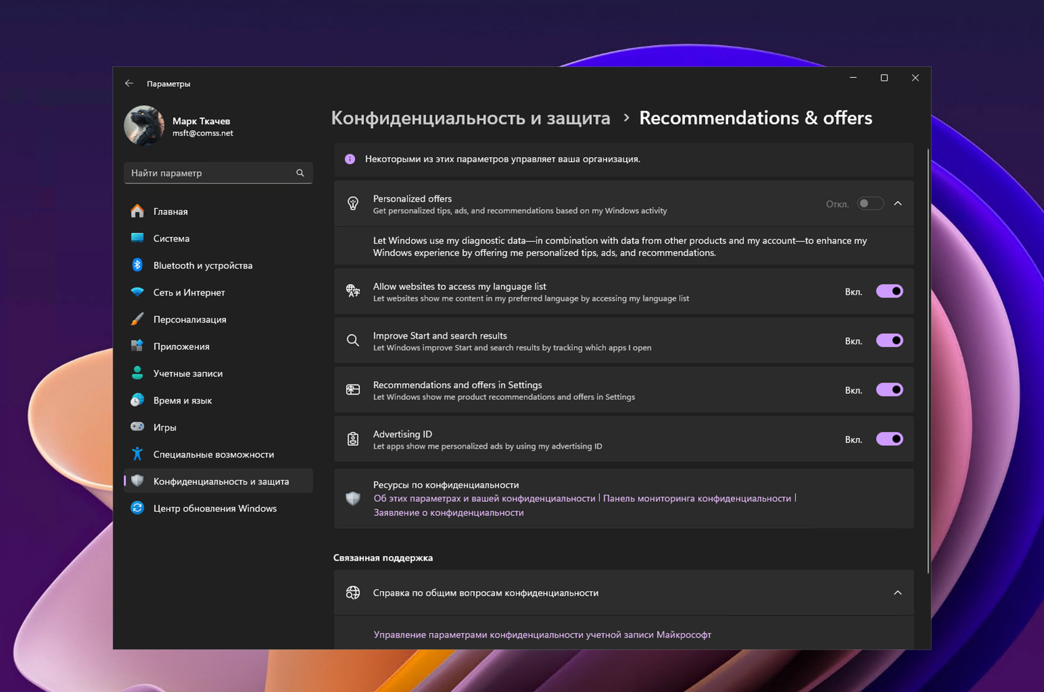 - Персонализированные предложения — получайте персонализированные советы, рекламу и рекомендации на основе активности в Windows.