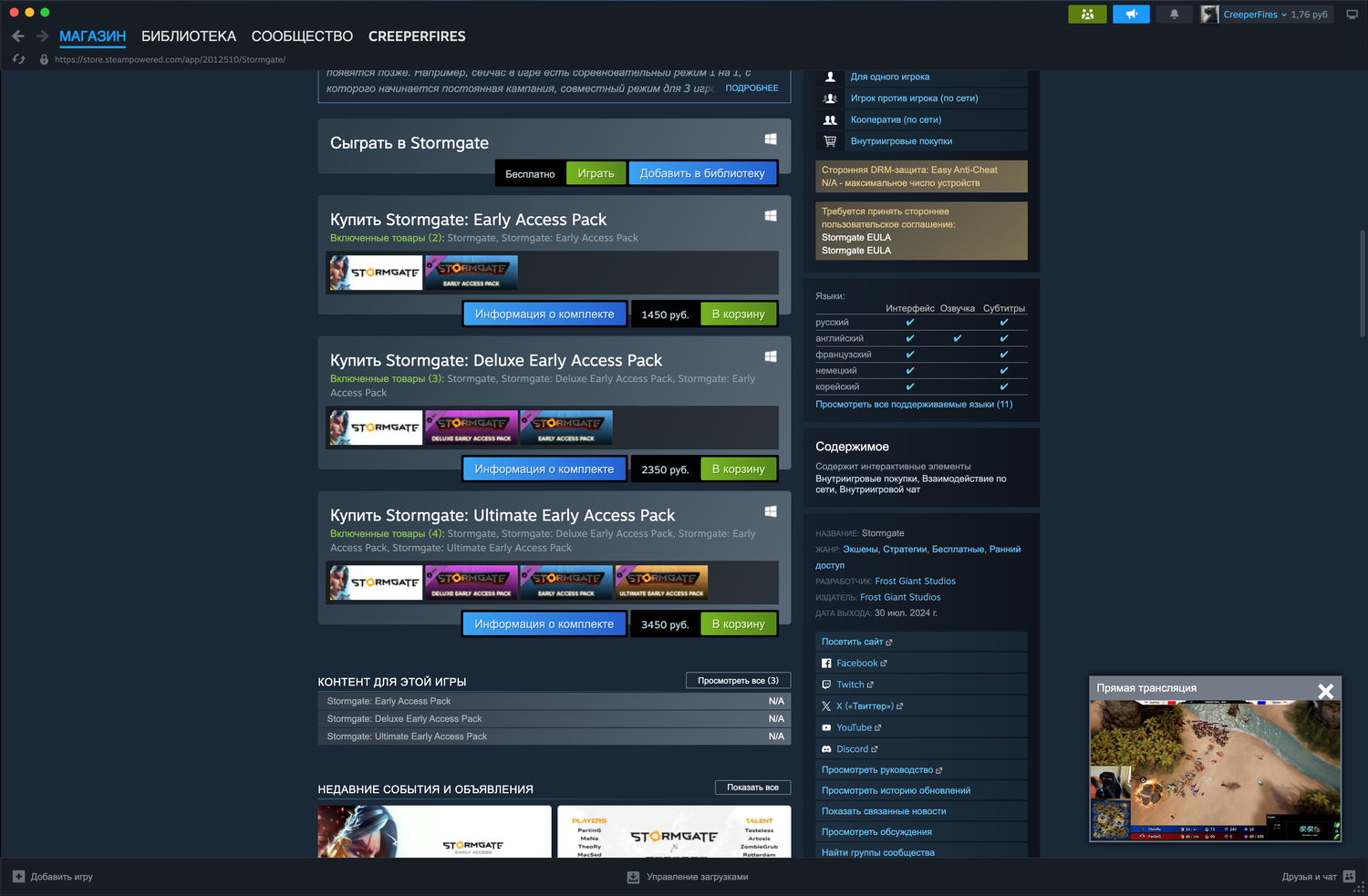 Stormgate распространяется по модели free-to-play, что означает, что базовые элементы игры доступны бесплатно. Однако, для получения доступа ко всем игровым возможностям, включая кампанию и полный набор героев, потребуется приобрести "Ultimate Early Access Pack", стоимость которого составляет 3450 pуб.