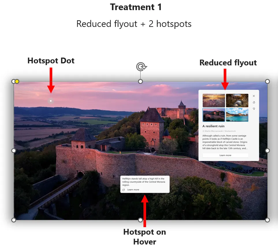 В первом варианте будет показано уменьшенное всплывающее окно и активные зоны, которые раскрывают дополнительную информацию при наведении курсора. Щелчок на активной зоне запустит страницу Bing.