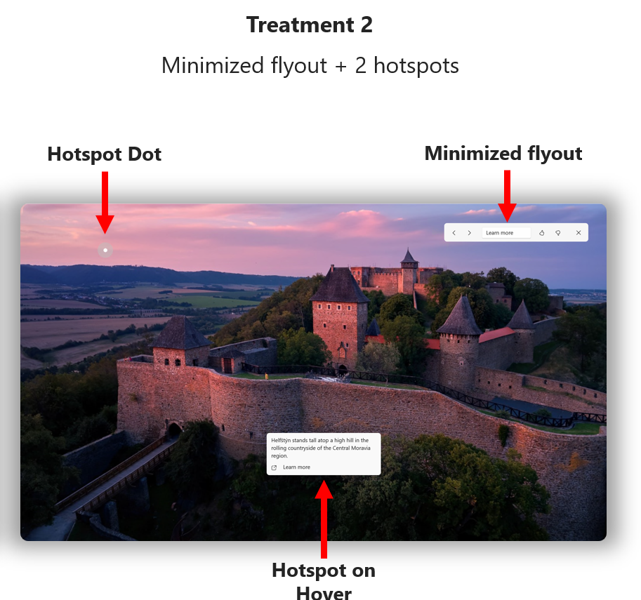 Во втором варианте будет показан минимизированный интерфейс Spotlight и активные зоны, которые раскрывают дополнительную информацию при наведении курсора. Щелчок на активной зоне запустит страницу Bing.