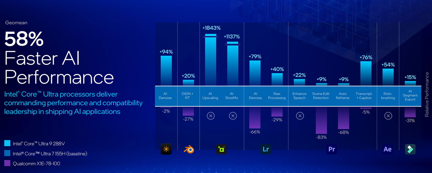 С ростом значимости ИИ в вычислительных задачах, производительность NPU стала ключевым параметром для процессоров. Lunar Lake может похвастаться до 48 триллионов операций в секунду (TOPS), что ставит его в один ряд с лидерами рынка, такими как Qualcomm Snapdragon X Elite (45 TOPS). Реальная производительность в таких приложениях, как Adobe Lightroom и плагин Stable Diffusion для GIMP, существенно превосходит конкурентов.