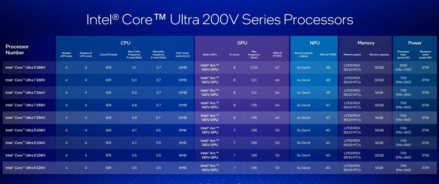 | Intel Core Ultra 7 258V | Intel Arc 140V GPU | 8 | 1.95 | 64 | 6x Gen4 | 47 | 32 | 17 | 37 |