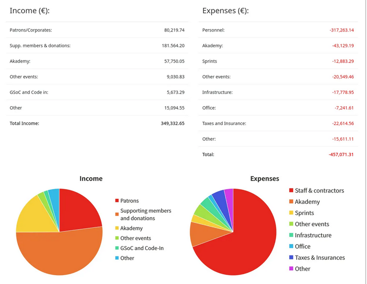 В прошлом году доход KDE составил 349,332.65 евро, в то время как расходы значительно превысили эту сумму и составили 457,071.31 евро. Основные источники дохода организации включают пожертвования от корпоративных спонсоров и отдельных поддерживающих участников сообщества. Однако даже с учетом этих средств, покрыть расходы в полном объеме не удалось.