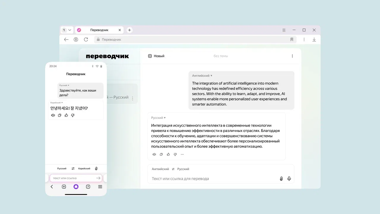 Для тех, кто часто работает с текстами на иностранных языках, Яндекс.Браузер представил бета-версию обновлённого Переводчика на основе YandexGPT. Этот инструмент научился распознавать контекст и предметную область текста, подбирая соответствующую лексику. Например, для научной статьи Переводчик использует специализированные термины, а для кулинарного блога — простую разговорную лексику.