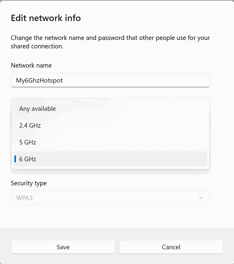 - Windows Mobile Hotspot был улучшен для поддержки подключения на частоте 6 ГГц. Новый диапазон требует наличия чипов, поддерживающих эту функцию, а также обновлённых драйверов. Не все чипы, которые в целом поддерживают Wi-Fi на частоте 6 ГГц, будут совместимы с этой функцией. Изменение будет видно в разделе Параметры > Сеть и интернет > Мобильный хот-спот, когда вы редактируете параметры мгновенного хот-спота. Для совместимости с существующими устройствами мгновенный хот-спот будет использовать 6 ГГц только при явном включении.