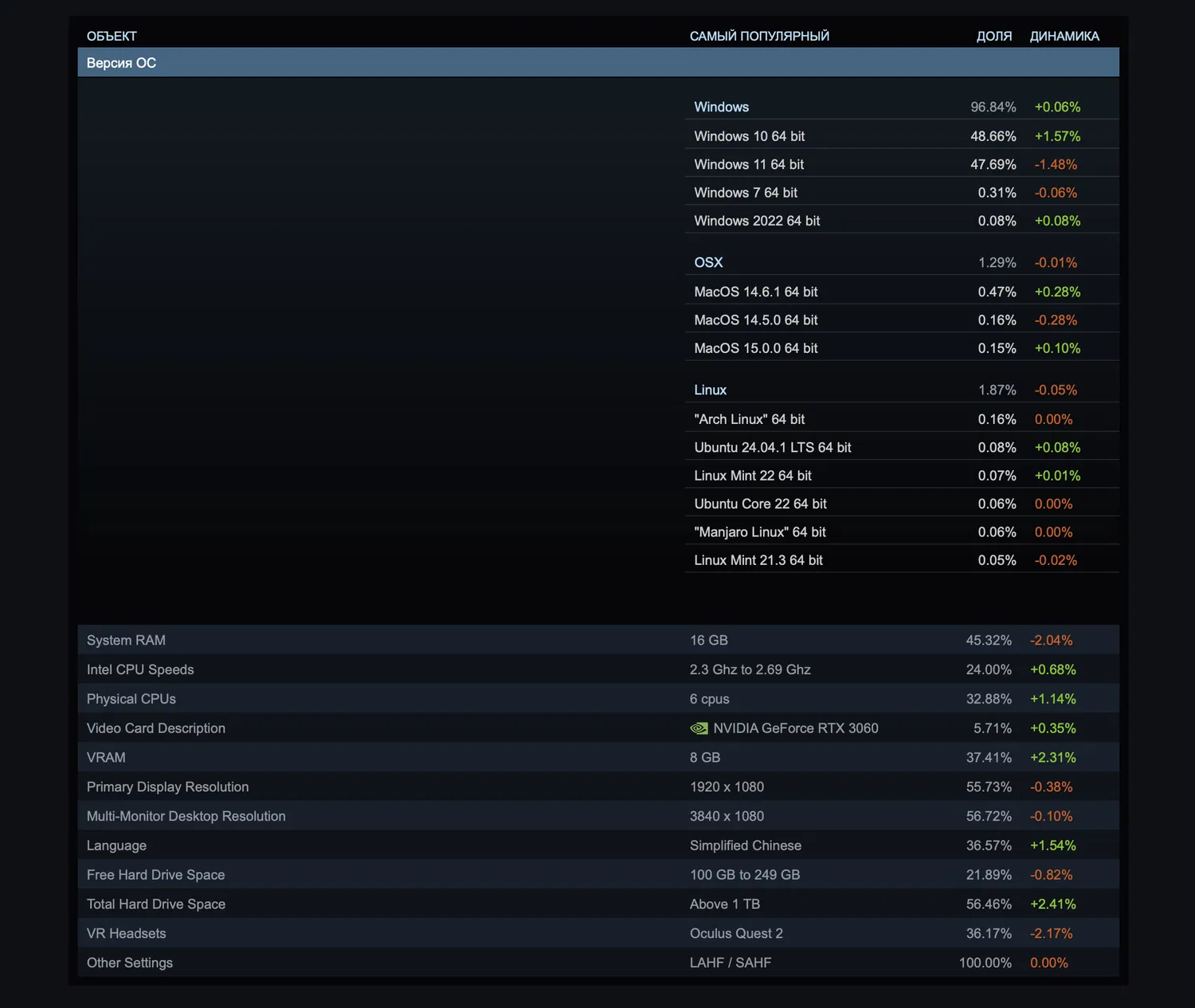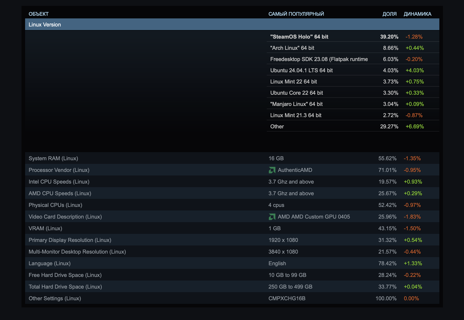 Мы часто замечаем, что с ростом числа пользователей Steam, выбравших упрощённый китайский язык, доля Linux снижается. Это связано с тем, что в Китае преобладает Windows, и огромное количество пользователей значительно влияет на общие показатели. Особенно это заметно благодаря популярности игры Black Myth: Wukong.