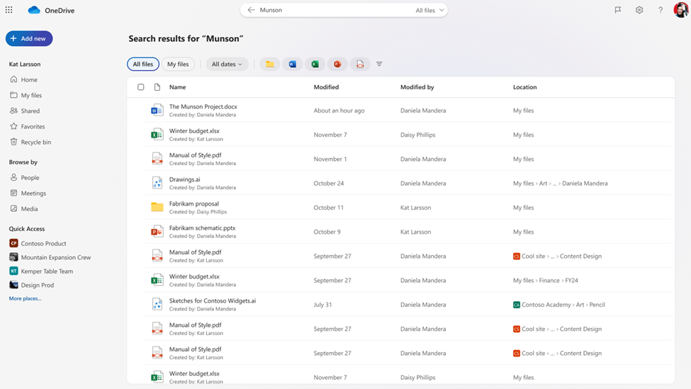 Наш улучшенный поиск — это настоящий прорыв. С новыми элементами фильтрации и более детализированными результатами найти нужный файл или папку стало проще и быстрее — как в вашем OneDrive, так и в общей библиотеке или папке коллеги.