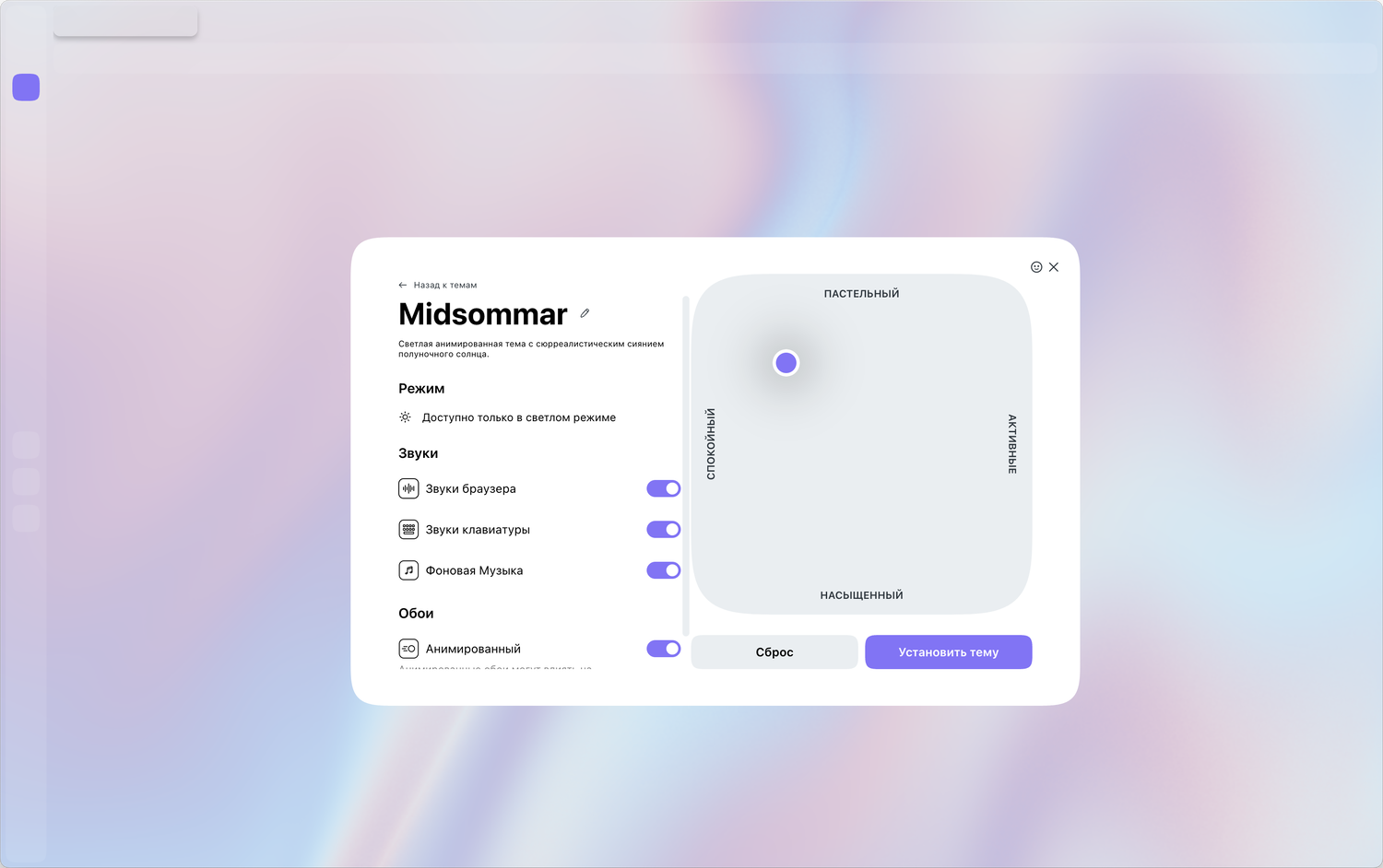 Тема Midsommar поставляется в светлом режиме и приносит в ваш браузер радостные вибрации полуночного солнца. Так же, как и в случае с Aurora, вы можете сделать ее анимированной или статичной, а также выбрать интенсивность анимации в палитре цветов. В дополнение к этому вы также можете активировать звуки клавиатуры и браузера — для таких действий, как открытие и закрытие вкладки. Фоновая музыка автоматически останавливается, когда вы воспроизводите видео или песню — и вы можете отключить ее в любое время, если захотите.