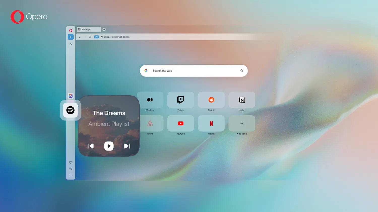 Opera One R2 позволяет управлять музыкой и видео, не прерывая поток ваших действий в браузере. При прослушивании музыки с помощью Opera One R2 вы можете навести курсор на значок проигрывателя, встроенный в боковую панель, и приостановить или пропустить песню во всплывающем окне мини-плеера. Кроме того, вы можете перетаскивать этот мини-плеер, чтобы он всегда был под рукой без необходимости переключать вкладки или приложения.