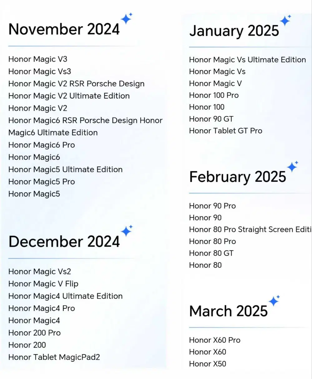 | Январь 2025 | Magic Vs series, Magic V, Honor 100 series, Honor 90 GT, GT Pro tablet |