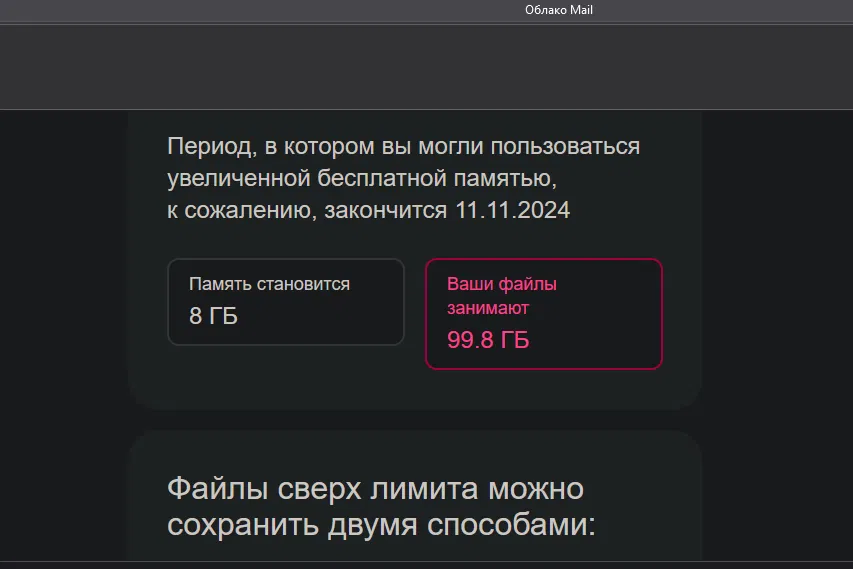 Таким образом, если у вас были бесплатные 100 ГБ, начиная с 11 ноября 2024 года, вы сможете использовать только стандартные 8 ГБ. Сохранение данных сверх этого объёма доступно через подписку Mail Space или локальное скачивание.