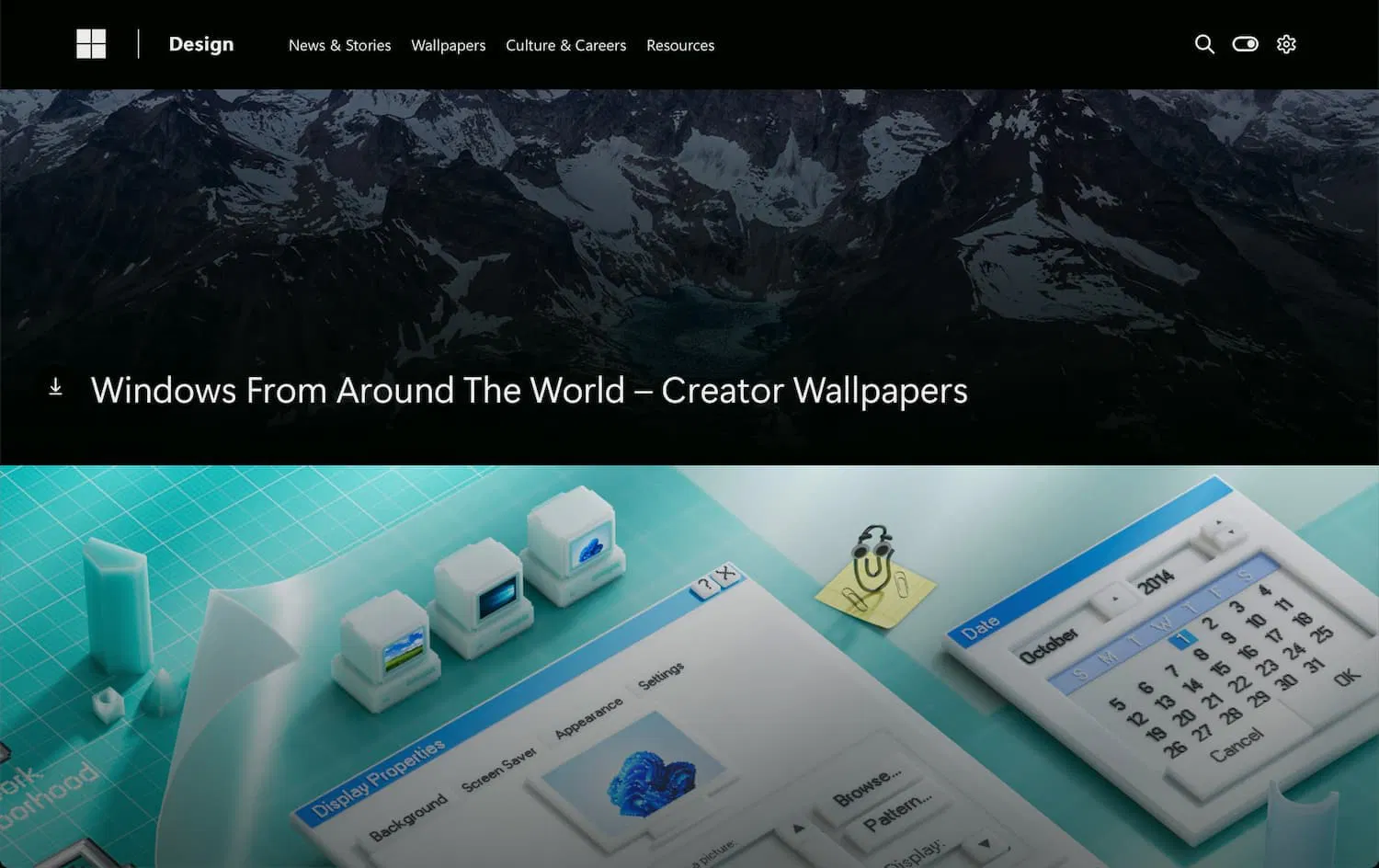 Третий вариант — официальный сайт Microsoft Design. Его раздел Wallpapers предлагает множество официальных обоев Windows и не только.