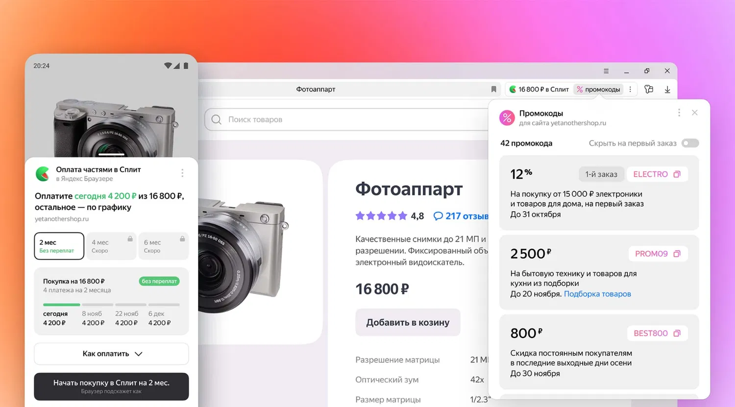 Яндекс.Браузер уже оснащен рядом функций для выгодного и удобного шопинга. Например, пользователи могут находить и применять промокоды, доступные на сайтах, а также использовать сервис Сплит для оплаты покупок частями. Комбинируя эти функции, пользователи могут оформить заказ с оплатой по частям и одновременно получить кешбэк, что позволяет гибко подходить к процессу оплаты.