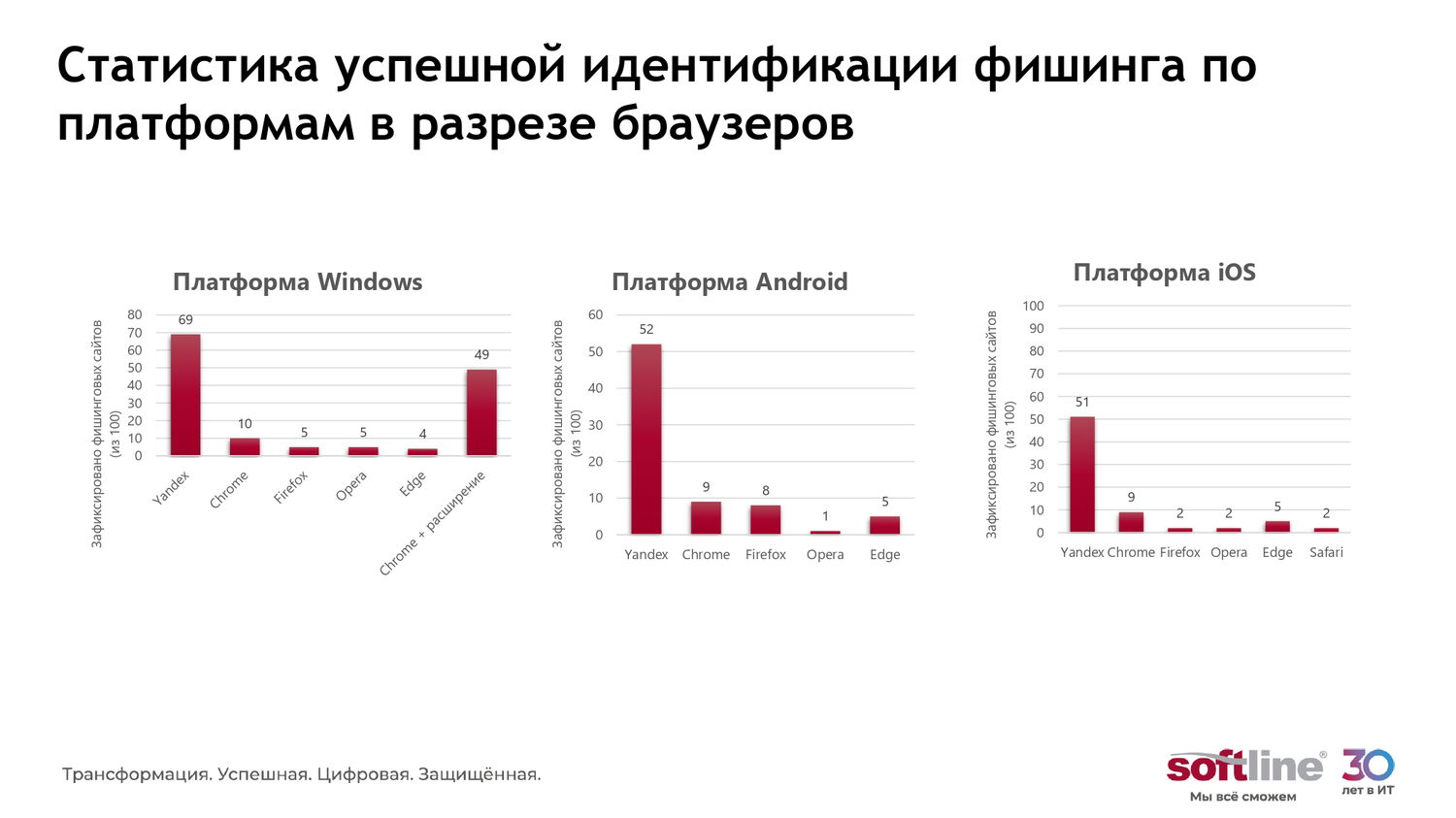Согласно исследованию ГК Softline, Яндекс.Браузер в семь раз эффективнее распознаёт фишинговые сайты по сравнению с другими продуктами. В этом ему помогает технология Protect, которая обеспечивает комплексную защиту в интернете. Protect не только блокирует вредоносные сайты, но и проверяет загружаемые файлы на вирусы, защищает пароли и платёжные данные, а также предупреждает о возможных угрозах при вводе банковской информации.