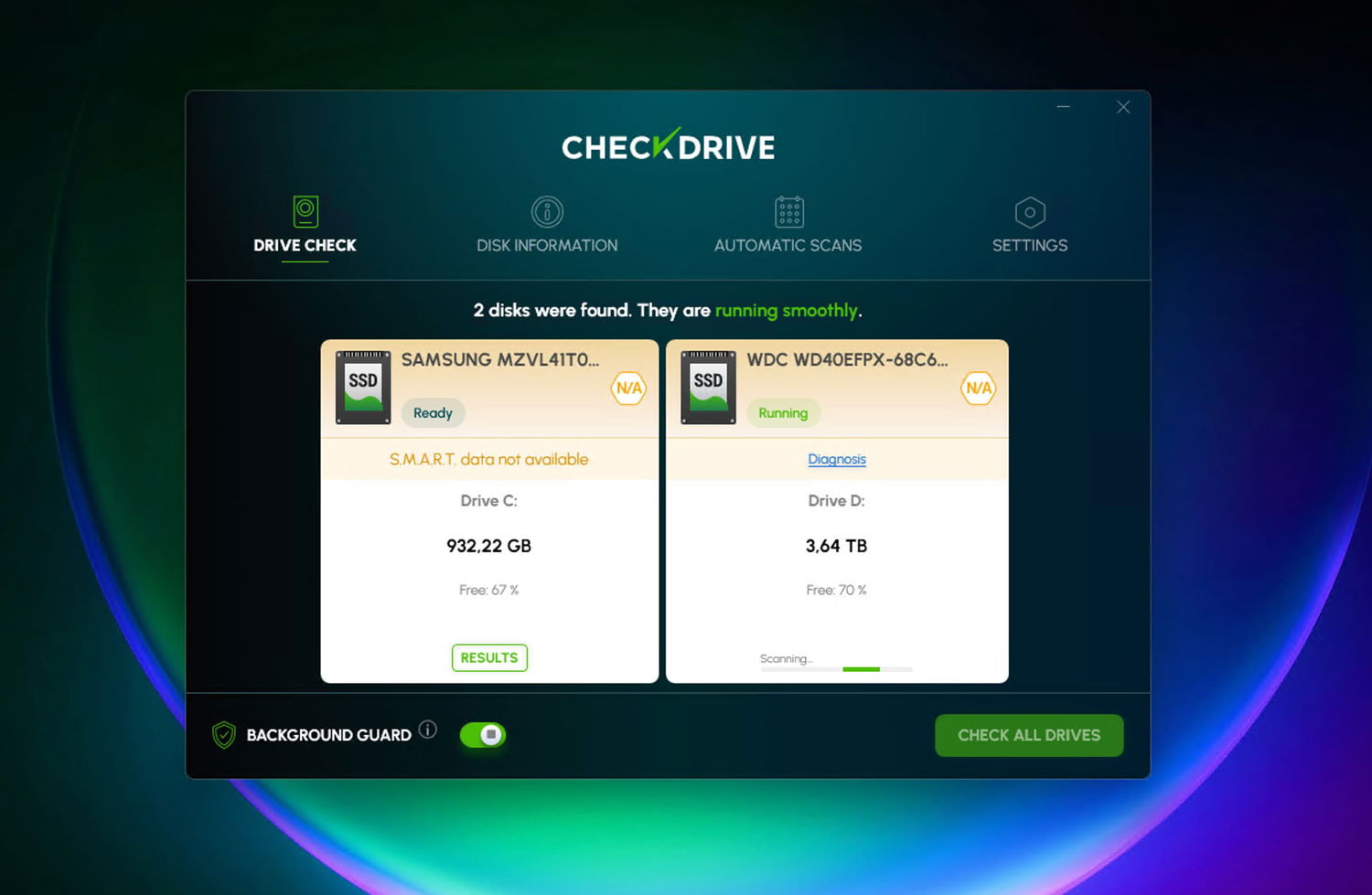 • Защита в реальном времени: Фоновый процесс CheckDrive Guard постоянно следит за состоянием жестких дисков и оперативно предупреждает пользователя о возможных неисправностях, что позволяет предотвратить внезапные отказы и потерю данных.