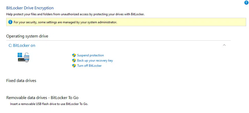 Проблема возникает при включении BitLocker, поскольку отображается сообщение об ошибке: «Для вашей безопасности некоторые параметры управляются администратором». Редмонд добавил, что сообщение может также отображаться в другом месте системы. Компания пишет: