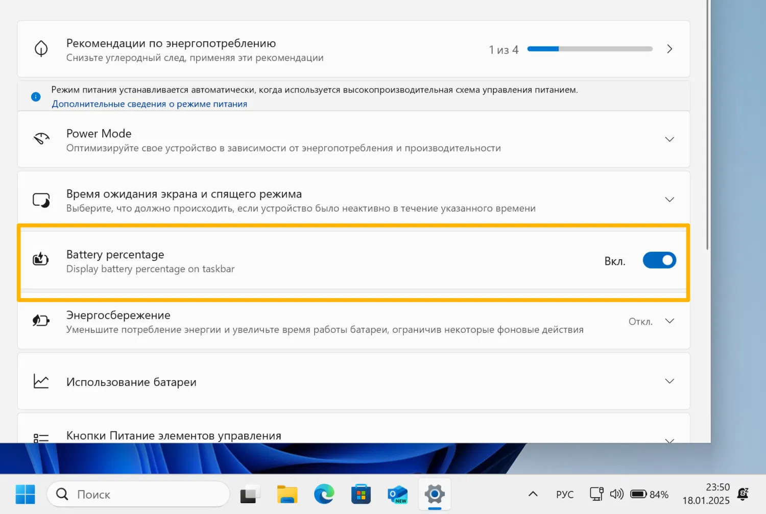 - Перейдите в меню «Параметры > Система > Питание и батарея» и включите опцию Battery percentage (Процент заряда батареи).