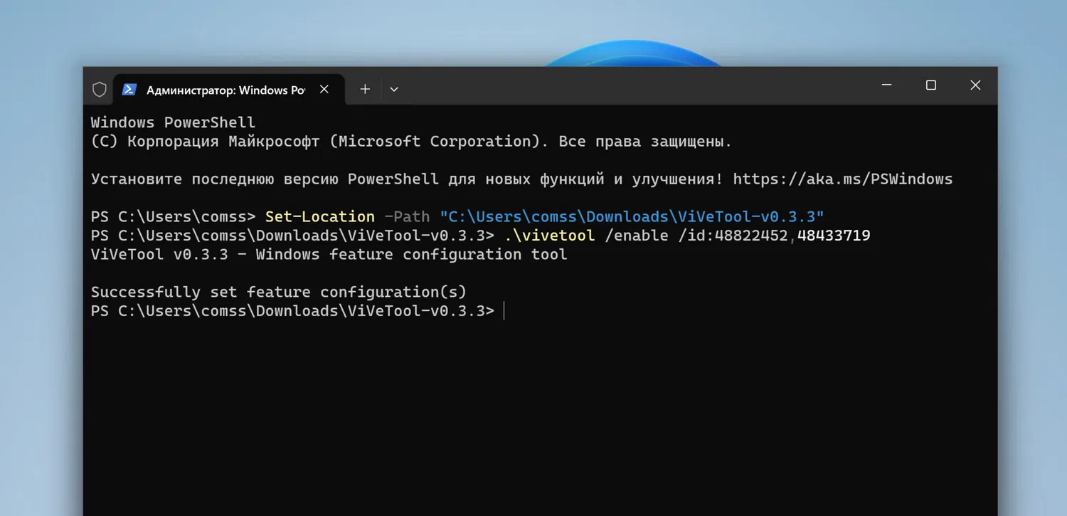 Примечание: В примерах используются команды в Терминале для профиля PowerShell. Если вы используете профиль Командная строка, замените начальную команду .\vivetool на vivetool.