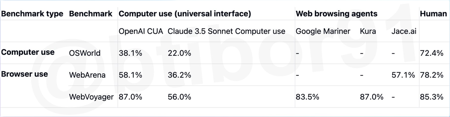 На официальном сайте также была размещена таблица, сравнивающая производительность Operator с другими AI-системами, такими как Claude 3.5 Sonnet и Google Mariner.