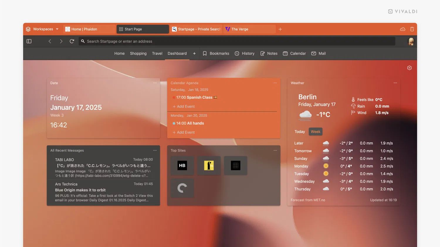 В новой версии Vivaldi представили виджет прогноза погоды, который позволяет пользователям получать актуальные данные о прогнозе погоды, не покидая браузера. Этот виджет можно закрепить на панели виджетов, где уже собраны инструменты, такие как почта, календарь и ленты новостей. Пользователи могут выбрать местоположение, чтобы всегда быть в курсе погодных условий, будь то для планирования прогулок или подготовки к дождю.